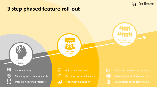 A phased roll-out of new features in your organization, will really help you to better control and govern the functionality that can be leveraged inside your organization. Simply because if features are enabled and after a month you decide to disable them, this might have a negative effect on the sentiment around the tool in your organization.