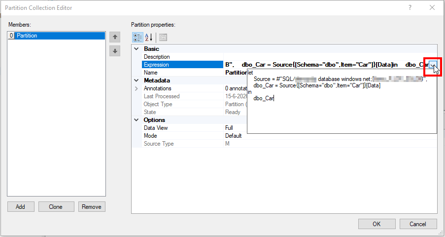Once the Partition Connection Editor opens, you can click the small dropdown button in the Expression field. Here you will find the Power Query Expression that we want to move to a dataflow. Copy the expression.
