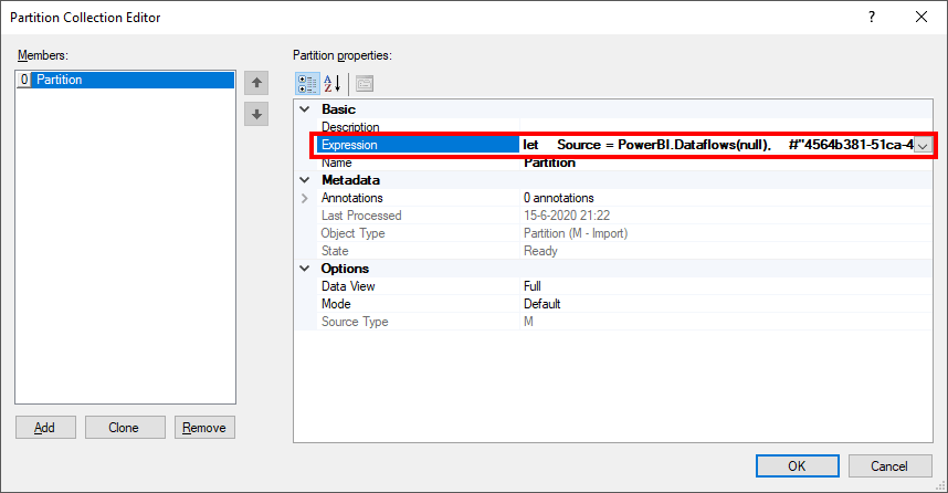 In the previous step we have copied the Power Query Expression for the dataflow. Now we go back to the Partition Collection Editor, as described in step 6, where we replace the existing Power Query Expression for the one pointing to the dataflow and click OK.