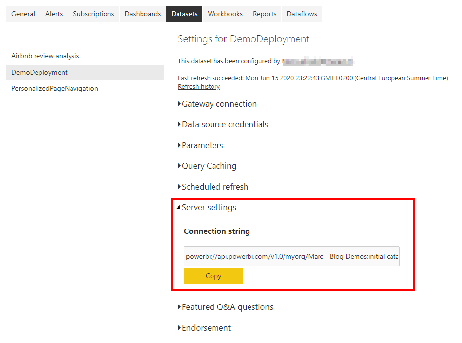 As second step we get the XMLA Endpoint from our earlier deployed model. We can get the endpoint by going to the Power BI Service and go to the dataset settings. In the tab Server Settings, we will find the endpoint.
