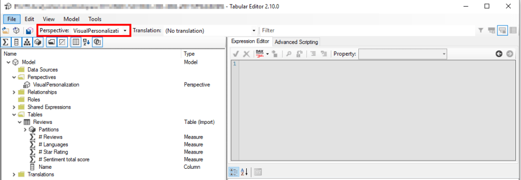 - After Tabular Editor opened, you will see Perspectives in the left menu. Right-click the Perspectives folder and click new and give it an explanatory name. In my case I named it: VisualPersonalization.