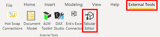 - Open your model in Power BI Desktop and go to External Tools in the top Ribbon where you will find Tabular Editor.