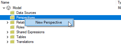 - After Tabular Editor opened, you will see Perspectives in the left menu. Right-click the Perspectives folder and click new and give it an explanatory name. In my case I named it: VisualPersonalization.