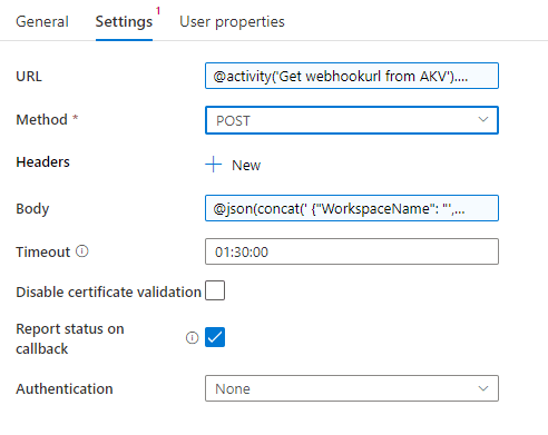 Previously we explained how you can get information from Azure Key Vault available in Azure Data Factory. The next step is to do the same for the webhook URL. As a building block in Azure Data Factory, we can use webhooks. In the settings of this webhook, please specify to use the output of the earlier step that retrieves the webook URL from Key Vault. In the settings of the Data Factory activity, you can configure this by adding the below snippet in the URL box. Please also make sure that the name referenced is in line with the name of the earlier Data Factory activity that retrieves the webhook URL.