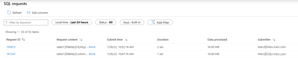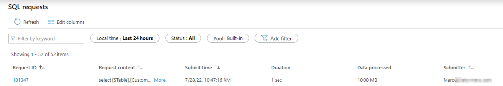 Let’s have a look at the query trace again. We now see all incoming queries are based on my personal user, as that is the one which we signed-in with. We can identify this by the most right column in below picture, which shows us the submitter.