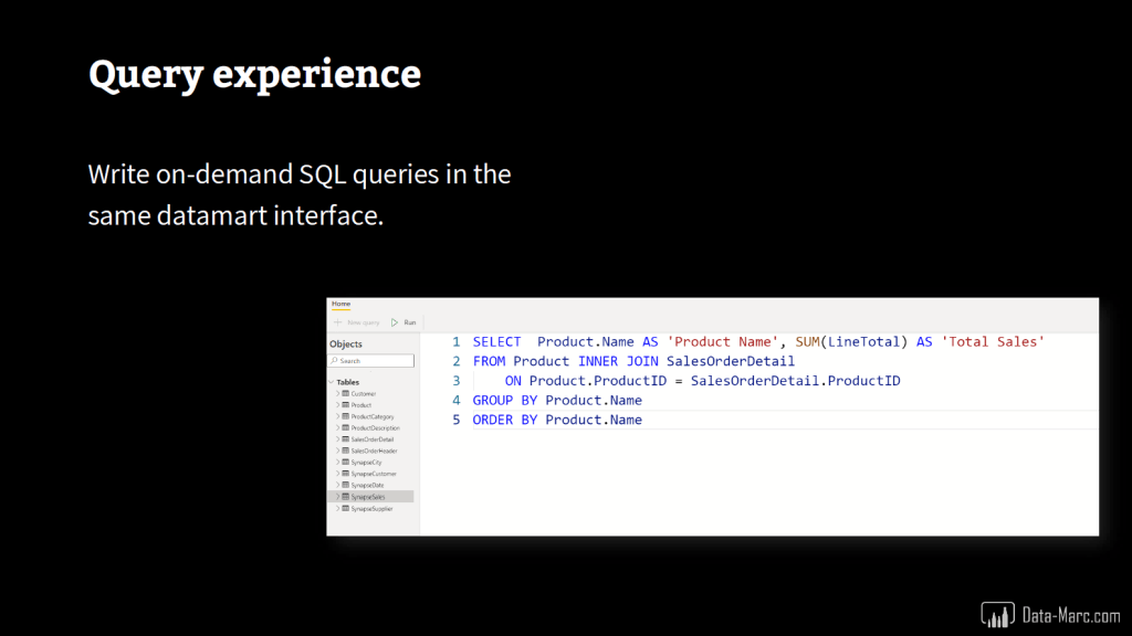But alternatively, you can also directly write your SQL expression in the Datamart experience. Which opens up Power BI for many new users who are comfortable with SQL, but not so much with Power Query or DAX. I think this is a huge benefit!
