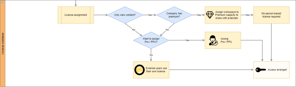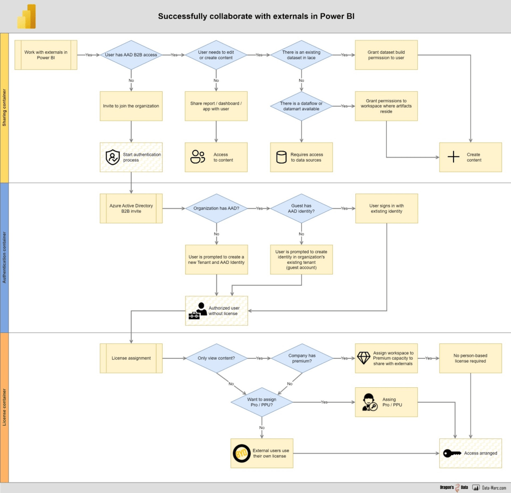 When you start working with externals, it all starts with the challenges of requesting accounts for external experts from the IT organization, which might take you a lot of time. In case you want them to work with their own user accounts, they must be enrolled as a guest to Azure Active Directory, which is the central security and authorization mechanism for all authentication processes to the Power BI service and other Microsoft services. Further, licensing is another key consideration, as external users may require an appropriate license depending on their use case. Last but not least, thing about what collaboration and input you expect from your external users, as specific tenant settings apply which might block them from doing certain things.
