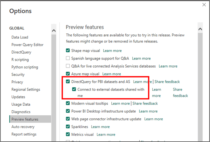 Finally, if you also want external users to work with your datasets in Power BI desktop, be aware that this requires certain preview features (at the time of writing in March 2023) to be enabled in Power BI Desktop. Without these configurations enabled, external users will not be able to connect to your Power BI datasets from Power BI desktop.
