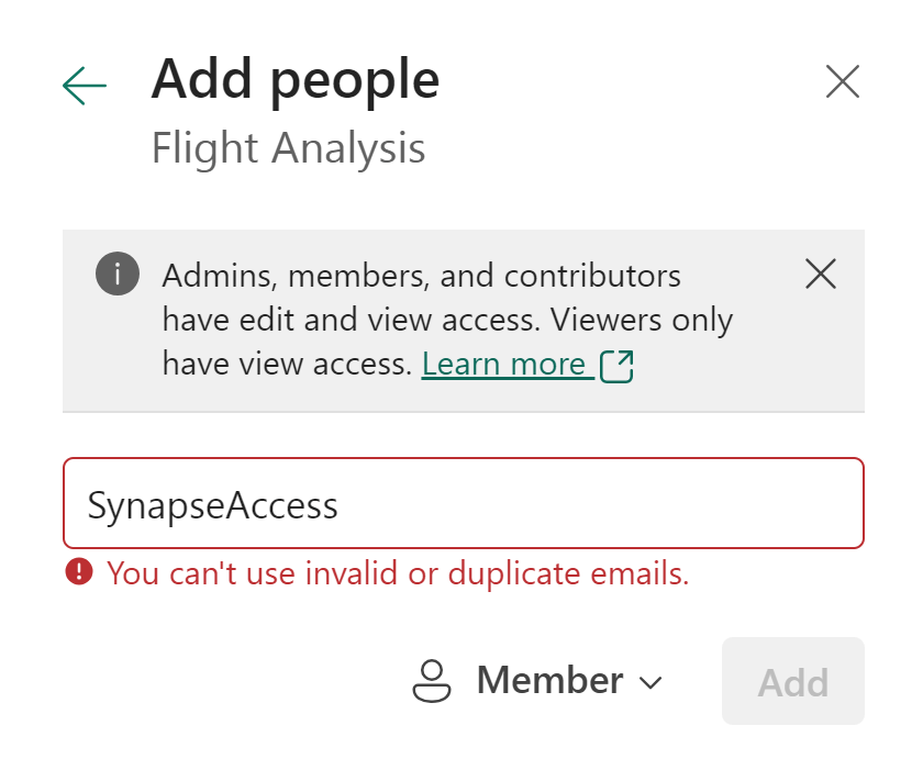 After creating the service principal in Entra ID (Azure Active Directory), it was a matter of just adding it in the workspace access menu, I thought. But I was wrong… When I entered the name of the service principal in dialog to add to the workspace, it showed the service principal had an invalid or duplicate email, which was totally confusing to me. See below screenshot as example.
