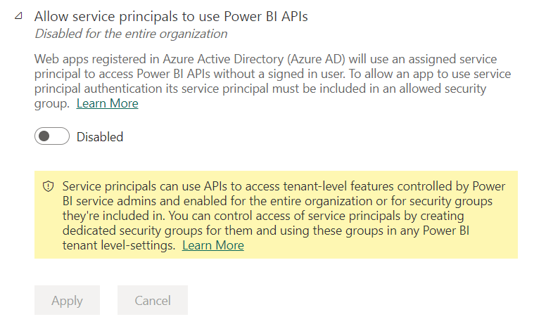 Web apps registered in Azure Active Directory (Azure AD) will use an assigned service principal to access Power BI APIs without a signed in user. To allow an app to use service principal authentication its service principal must be included in an allowed security group. Learn more
