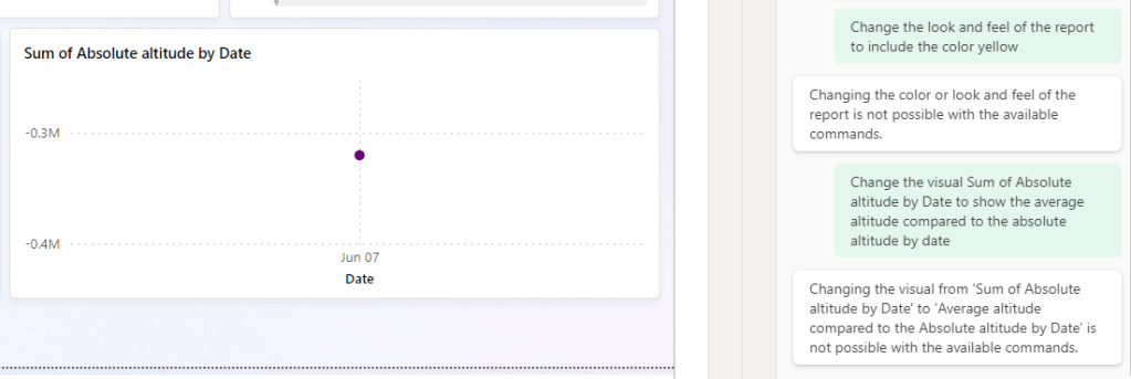 Also, in above experience I was happily surprised with the understanding of my drone data. However, when I asked copilot to generate a report for it by just using the prompt: “build me a first report” it came up with something totally pointless… Counting LensDetails? Average relative altitude by LensDetails? Sum of an absolute altitude? In all fairness, the only relevant metric it came up with, is the average of relative altitude. That is actually something useful to have a look at.