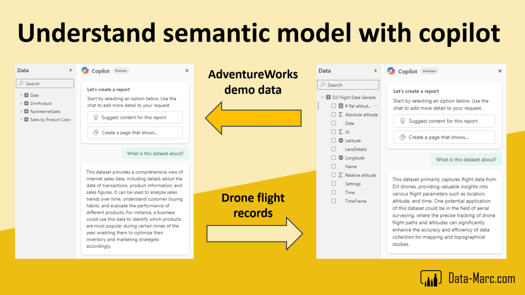 Let’s take the example of having copilot in Power BI. It’s pretty awesome in helping users understand the context of their semantic model. Which columns it includes, grasping an overall idea what could be in the semantic model. However, at the same time language is key. Also, regularly I come across semantic models that don’t have pretty names like “Client Name” or “Sales Amount” but more things like “ClientName” or “_CalcSalesAmt”. Having proper naming is a good idea anyway for understandability of your semantic model. I tried this feature on both AdventureWorks demo data, as well as my drone fligh analysis, which is not the typical semantic model you will come across. The results where fine, but again both models have decent naming of tables and columns.