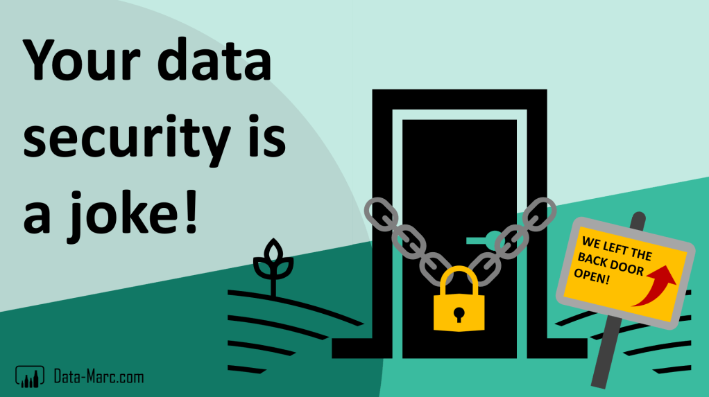 Yes, you read it right. Most security implementations on data estates are a joke. It’s just closing your eyes for what you can’t see or don’t feel responsible for. Too often I come across situations where the lack of security awareness and proper implementation results in locking the front door but leaving the back door open.