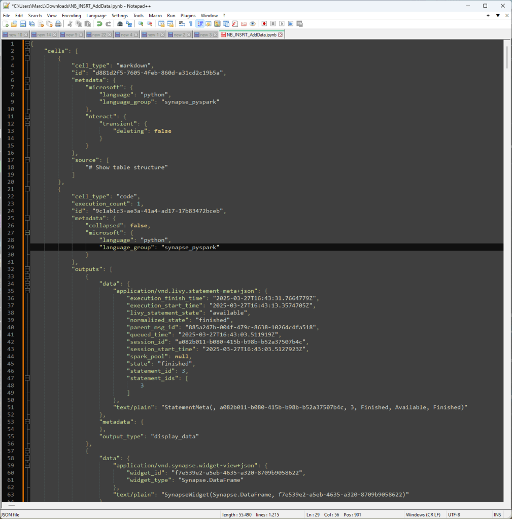 I clicked Download and end up having the file in my Downloads folder. The file can now be opened with any code editor of your preference and is formatted as a JSON file. Everything will be in a single line, but after using the pretty print option in Notepad++ (my personal favorite) I got to see the structure of all cells in my Notebook.