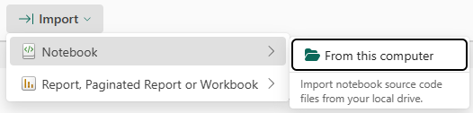 Just for the sake of proving my point, I now switch to another tenant entirely. Here, I will import the same Notebook, as I would like to use this as a template for a new solution I’m building. I start from the Workspace ribbon to click Import, Notebook, From this computer.